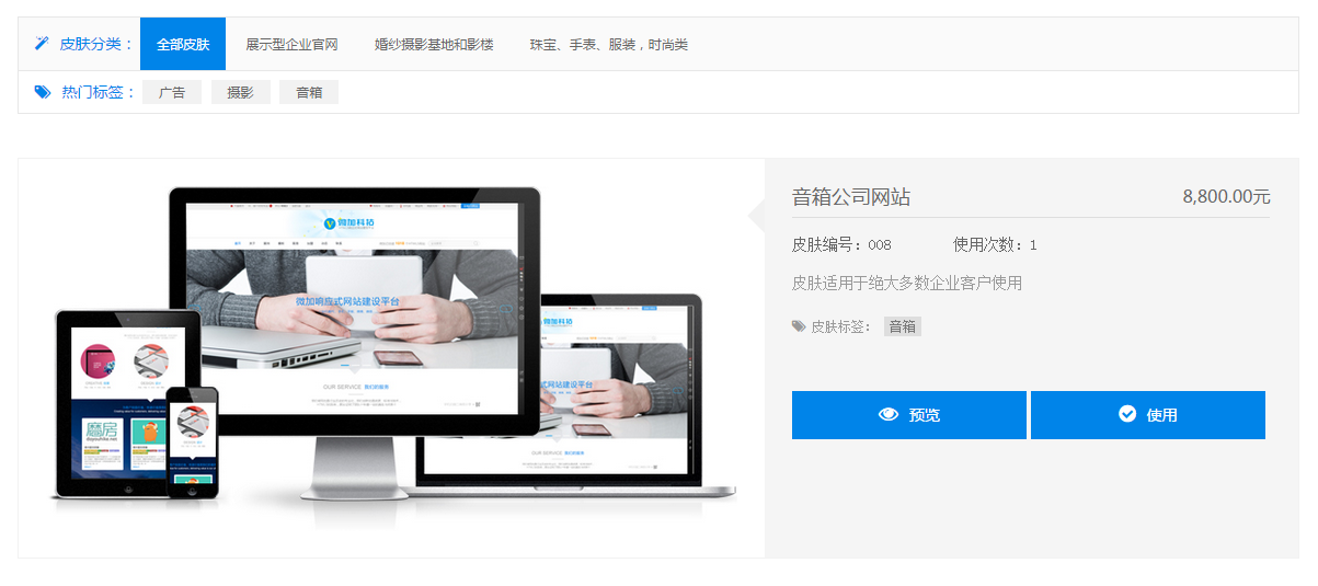 3. 进入皮肤栏目,可以进行网站创建操作。