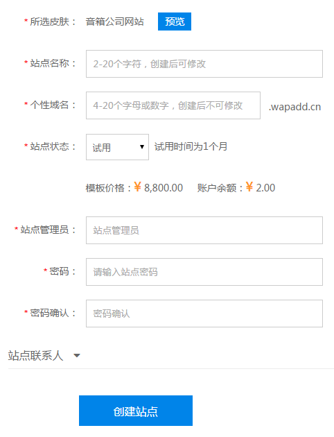 5.设置站点相关信息,点击 创建站点 即可创建网站。