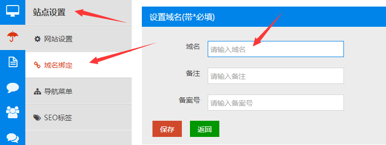 2.登录站点后台 => 站点设置 => 域名绑定,在这里填入您的独立域名,然后点击保存。