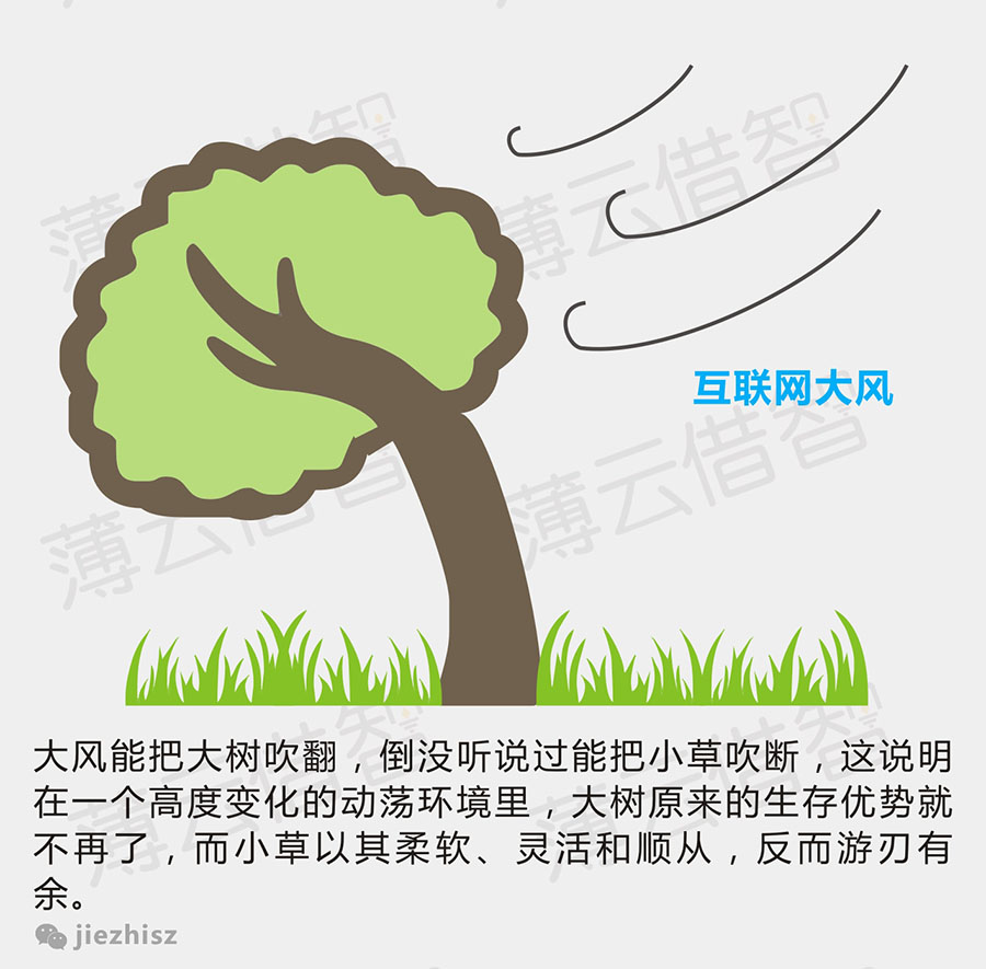 因此,与其对“草根”们抢自己的饭碗愤愤不平,不如想想自身企业如何向“互联网+”转型,放下自以为是的传统,放低身段,由硬变软,让自己的心胸格局更加开放和包容。